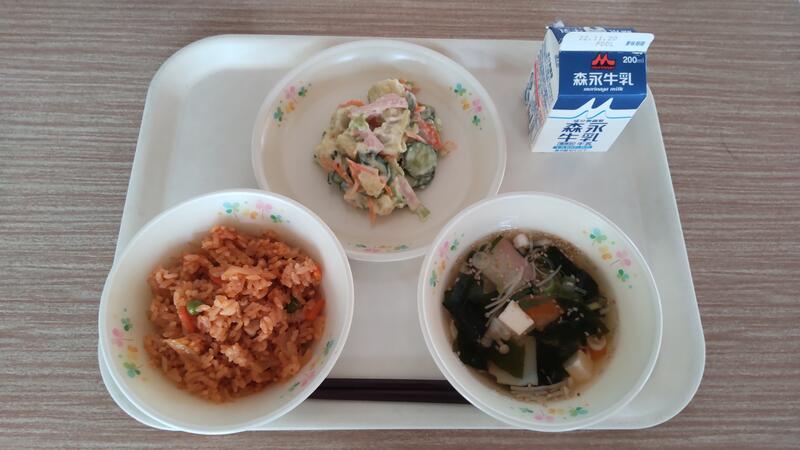今日の給食は大好評でした。「また食べたいです!」とか「サラダが少し甘くておいしかったです」とか。ポテトサラダは、今回サツマイモで作りました。さいの目切りにし、潰しませんでした。チキンライスはいつもの量より多めに作りましたが、きれいに食べていました。家ではトロッとしたオムレツをのせるとさらに美味しくなると思います。お芋でおやつを作っても楽しいでしょう。お休みの日にぜひクッキングに挑戦してみましょう♪