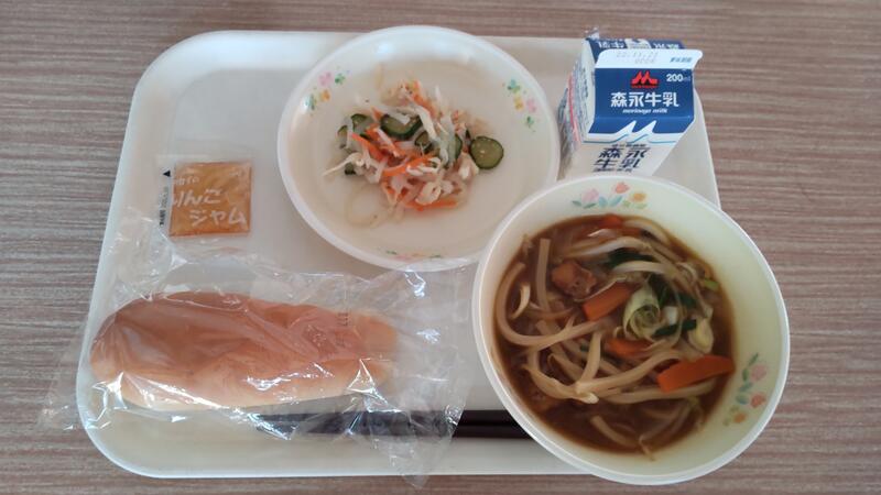 麺料理は大量調理はとても難しいと思います。時間が経つにつれ、麺が汁を吸ってドロッとなってしまいがちです。しかし、さすがは調理員さん! 具はシャキッとした食感で、汁もしっかり残っていました。子どもたちにもとても好評でした。またリクエストに挙がりますかね?楽しみです♪