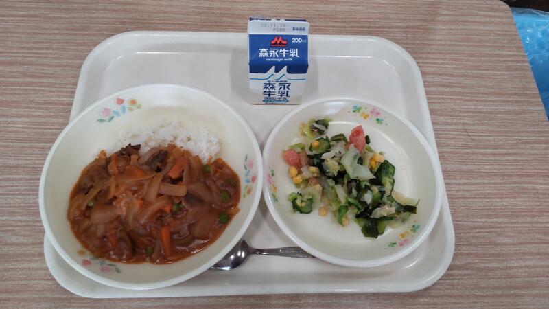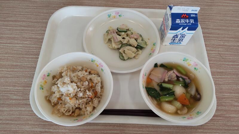 今日は給食前に展示食の雑炊を見て「おかずにご飯が入ってる!」と興味津々でした。だしの味がしっかり効いていて、米もさらっとしたまま食べられたようでほっとしました。サラダもリクエストだったので喜んでもらえ良かったです。