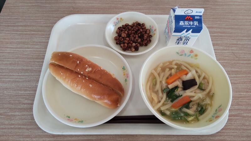 今日はセレクトパンでした。レーズンパンは好みがあるので、毎回セレクトにしています。今回はミルクパンとのセレクトでしたが、小学校中学校ともミルクパンのほうが少しだけ多かったです。トックは韓国の雑煮です。今日は日本のものと同じようにだし汁に鶏肉、里芋、白菜、大根、椎茸、そして餅を入れました。韓国料理は野菜や魚介類も多く、栄養バランスもとれていて、和食と少し似ています。家で外国料理に挑戦してみるのはいかがでしょうか?