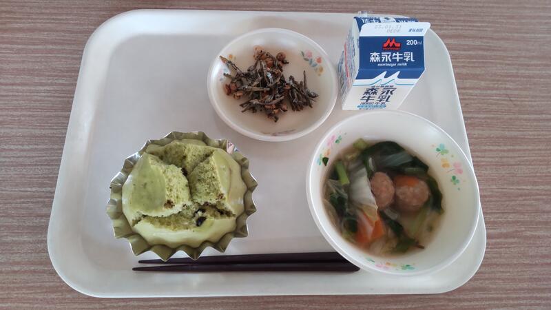 今日は「抹茶蒸しパンだよ、おいしそうだね」と先生がひと声かけると、低学年の児童が興味津々で取り囲んでいました。「おいしそうだね」の一言で、子どもたちの食欲は一気にアップします。今朝は一面の雪景色。とても冷えました。給食を楽しみに登校してくれた児童がいるかも…と張り切って作りました。