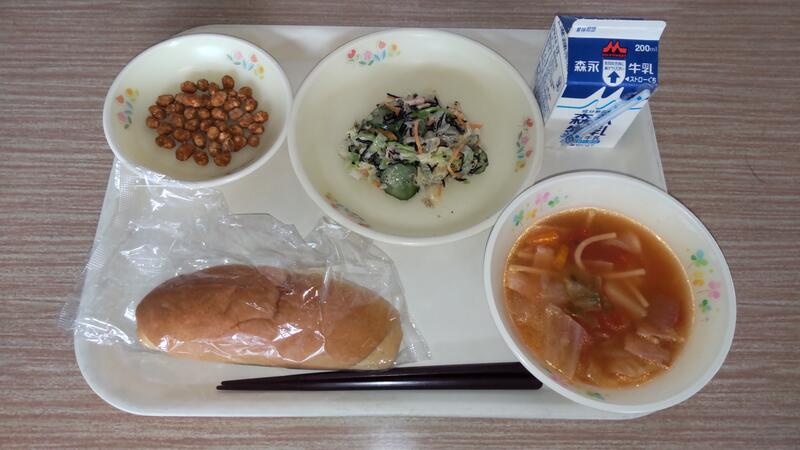 体の健康は、毎日の食生活が非常に関係してきます。特に塩分と脂肪の摂り過ぎは、子どもの頃から気をつける必要があります。また、体重も急に増やしたり減らしたりできません。今日も野菜のうまみをいかしたスープ、噛むことを意識した黄粉大豆、野菜や海藻そして豆など食物繊維たっぷりの献立でした。ご馳走でないですが、お腹いっぱいになったそうです。