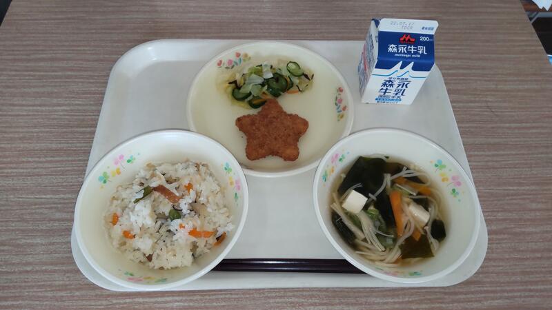 野菜はほとんど手切りしていますが、大量のときや忙しい献立のときはスライサーでカットしています。機械で切るので同じになるように思いがちですが、実は機械の使い手によって仕上がりが微妙に変わってきます。特にごぼうは機械の入れ方で長さや歯ごたえが違うのです。今日は、どれもきれいに食べていました。炊き込みご飯や混ぜご飯のおいしい季節になりました。大豆を入れるとうま味と歯ごたえが増して美味しくなります。ぜひお試しください。