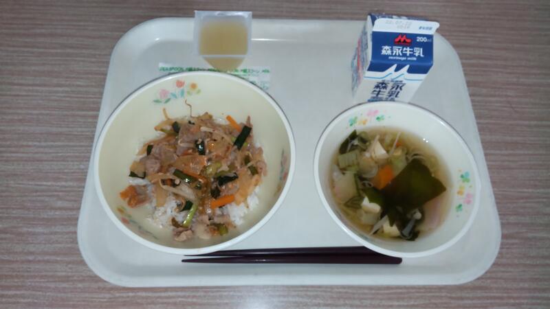 今日は牛肉と筍を炒め、赤みそを使わず、おろしにんにく、おろしショウガ、醤油、みりん、砂糖、ごま油、豆板醤で調味しました。これに大根、もやし、ほうれん草、人参を加熱して醤油で軽く調味したものを和えて仕上げました。シャキシャキの食感が残り、子ども達もご飯がすすんだようでした。家でも、キムチや温泉卵などをのせて、ぜひ試してみてください。