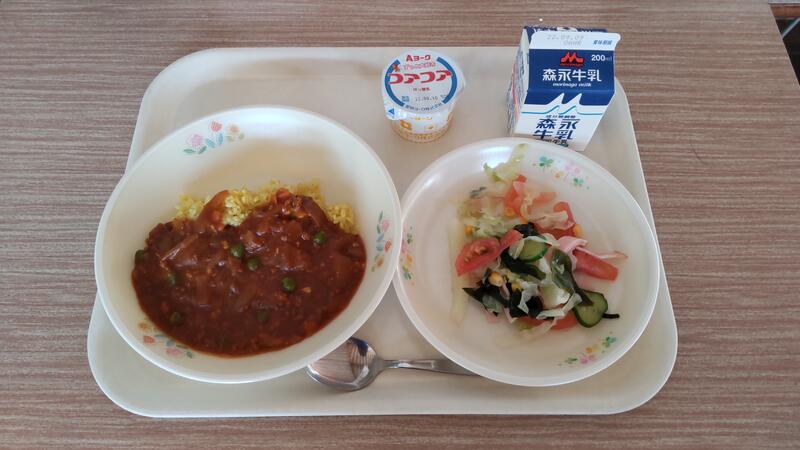 今日のドライカレーもトロッとなめらかで、玉ねぎの甘味とカレーの風味が食欲をそそりました。2年生の給食当番が「ねえ、見て!」と黄色いご飯を囲んで喜んでいました。本来はサフランで色を付けたいところですが、カレー粉とバターを入れてご飯を炊きました。ちょっとしたことですがとても反応がよく、食も進んでいました。器や盛り付け、野菜の切り方などでも食欲は変わってきます。ぜひ、子どもと一緒に楽しい食卓を作ってみませんか?