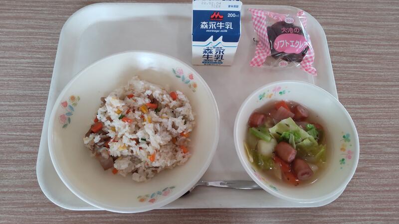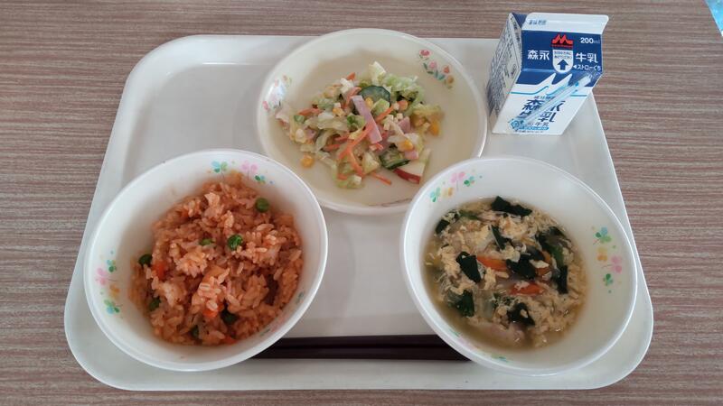 今日のスープはふわふわスープと言います。かきたま汁と作り方は同じですが、とき卵にパン粉と粉チーズを入れ、ふわふわ感をアップしています。ぜひお試しください。今日の食材もたくさんありました。チキンライスには、麦を入れました。キャベツはいつも芯まで使います。生活習慣の予防、快便、消化吸収、あごの発達等、カミカミメニューはいいことづくめです。これからも食物繊維、噛むことを意識した食材選びと調理を心がけていきたいと思います。