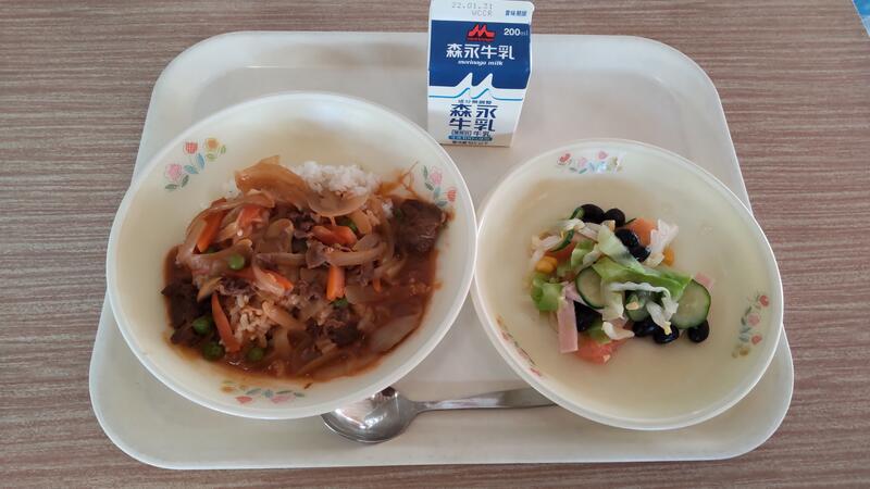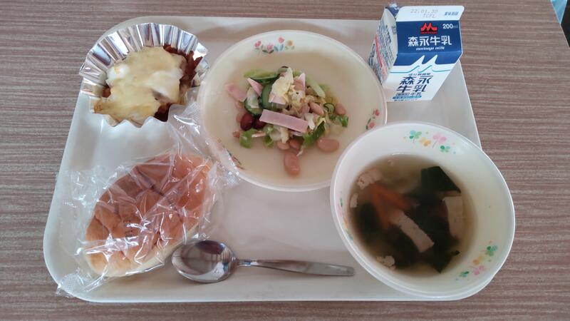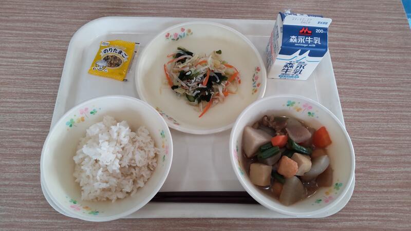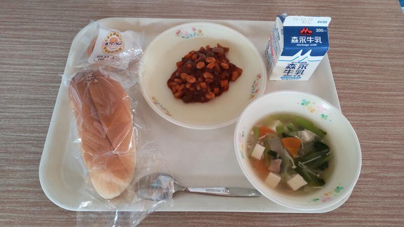 今日のポークビーンズは地元山鹿の大豆、北海道産の大福豆と金時豆を使いました。おかげでとても満腹感がありました。お昼の放送でも、大豆になる前の畑、鞘に入った枝豆、大豆からできる大豆製品、そして学校に納品してくださる大豆農家の方の画像を見せて話しました。豆のある日は食べるのに時間のかかる人もいますが、放送のおかげか今日は「おいしかったです!」といつもより早く食べ終わっていました。大豆の良さをたくさん伝えていきたいと思います。
