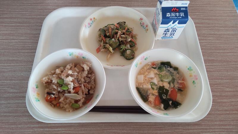 チキンライス、わかめご飯、キムチ炒めご飯、チャーハンなど、混ぜご飯はリクエストによく挙がります。11日は鹿北小の遠足です。「お弁当作りに挑戦しましょう!」と声をかけているので、ゆかりご飯やオムライスなどご飯にいろいろ混ぜて作る児童もいるかもしれません。おにぎりだけ、詰めるだけでも十分だと思います。ぜひお家の方と楽しくお弁当を作ってほしいと思います。