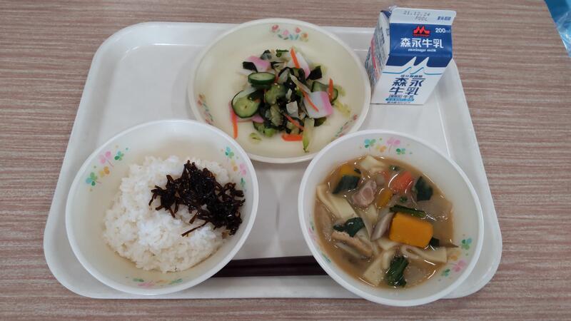 今日はサラダに使ったごぼうがとてもきれいに切られていたのに気づいたでしょうか?やはり包丁で切ると、機械で切るより断面がきれいで、和えたときに水分があまり出ません。シャキシャキ感と香りも残ります。おいしく食べてもらいたいという心遣いからでしょう。本当にありがたいです。今日もたっぷりの野菜を使いました。春雨が入っているので食べやすい煮物です。明日からまた寒くなりそうです。鍋料理、シチュー、煮物、スープなど、冬野菜をたくさん使った温かい料理で風邪を予防しましょう。