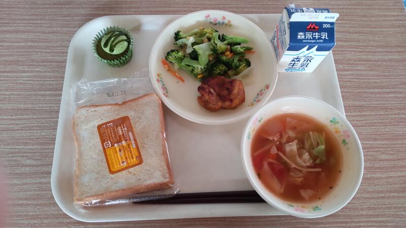 食パン ミネストローネ タンドリーチキン ケーキ ブロッコリーサラダ はちみつ&マーガリン 牛乳