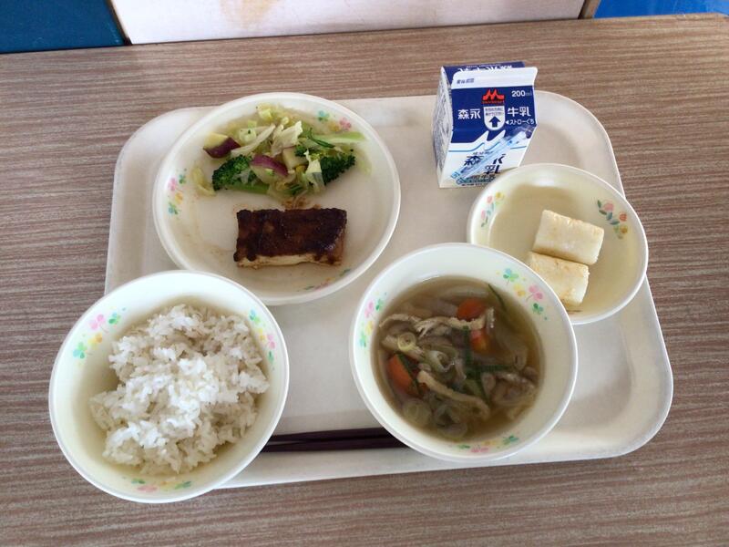 牛乳 ミルクパン 白菜のクリームスープ 魚の黄金焼き 寒天サラダ