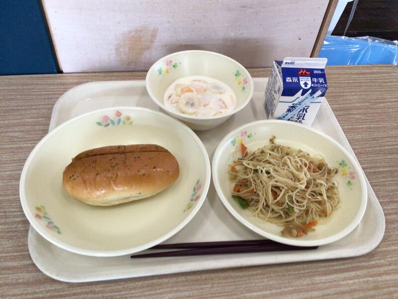 今日は、まぜそば風ビーフンです。今回の給食週間は、「お米の魅力再発見」というテーマで稲作に思いを馳せる献立でした。最後の今日は、米に関する外国の食文化の紹介でビーフンの料理です。台湾や中国南部でよく使われている食材で、うるち米を原料として作る押し出し麺のことです。中国語で米粉=ミーフェヌです。中華味です。よく噛んで食べましょう。
