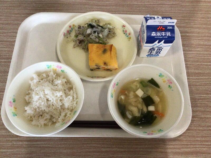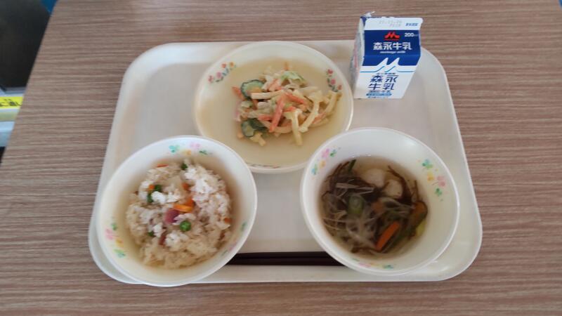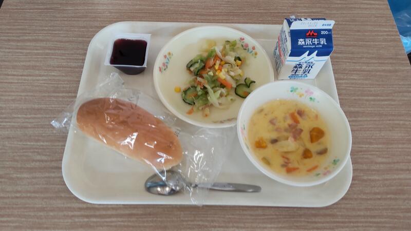 今日は大量の白菜でした。クリームシチューは人気があるのですぐに食べてしまったようですが、コーヒーゼリーは苦手な人もいました。苦味が和らぐようにとコーヒークリームをつけたので、食べやすかったという児童もいました。ポテトチップスをかけたサラダ、クラッカーをつけたシチュー、セルフバーガーや手巻き寿司、シチューにパン生地をつけて焼いたきのこスープなど、いつもと食べ方が少し変わっただけで、食べる意欲が違ってくるようです。サラダ菜で巻いて食べる、ナイフとフォークで食べる、自分で焼いて食べるなど、給食では難しいですが、食事を楽しくする工夫も大事にしていきたいと思います。