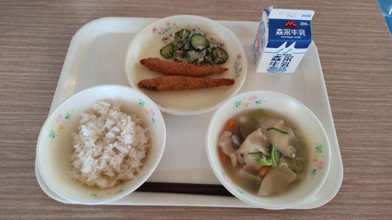 外はとてもいいお天気で暑いくらいでした。そろそろ里芋も出る頃だろうと団子汁を出しましたが、少し早かったようです。団子汁は熊本県の郷土料理ですが、地域によってさまざまです。団子はじゃがいもをすり下ろして作ったり、サツマイモを練りこんだり、麺のように包丁で切ったり…。味付けも醤油だったり、味噌だったり、小豆やそら豆と砂糖で甘く仕上げたり…。コシの強さやなめらかさも好みが分かれるところです。給食では小麦粉と米粉を半々の割合で使っています。団子汁はこれからがおいしくなります。ぜひ親子で作ってみてください。