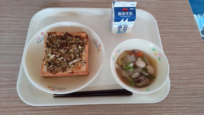 今日はお好みトーストをしました。給食で作ったのは初めてで、見た目はあまりよくできませんでしたが、味はよかったようで意外に好評でした。作り方は、ツナ、千切りキャベツ、薄切り玉ねぎをお好み焼きソースとマヨネーズと混ぜて食パンにのせ焼きました。仕上げにかつお節と青のりをかけるとできあがりです。給食ではこの他にも、ハニーレモントースト、ピザトースト、アーモンドトースト、ココアパウダーを振りかけるくまモンパンなどを作っています。ぜひいろいろな具材を載せて作ってみてください。