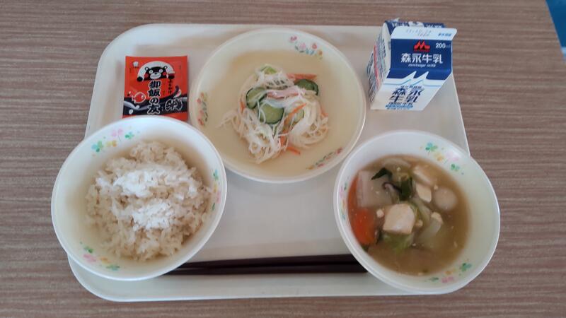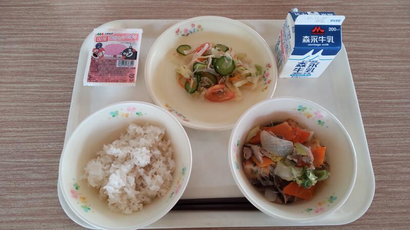 今日は「ふるさとくまさんデー」で宇城地域を紹介しました。昨日のうちに写真を見せて話をしていたので、子供たちは「今日はびりん飯だったー」と献立名を覚えていました。白玉汁は小餅が入っていて、だしが効いた上品な味になったので「お雑煮みたい」と喜んでいました。郷土料理は贅沢な食材を使わなくても、地元の食材を十分に生かし、おいしくなるよう工夫されているなあといつも感心します。いつでもどんなものでも手に入る時代になりましたが、郷土の食材や味を大切に伝えていきたいと思います。