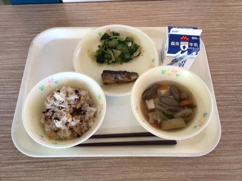 今日は、つなひきよいしょです。山鹿市三玉には、民話の『不動岩と三岳の彦岳権現の綱引き物語』があります。おいしい小豆を食べて育った不動岩とかたい大豆を食べて育った三岳の彦岳権現が綱引きの勝負をして、かたい大豆を食べて育った三岳の彦岳権現が勝ちました。この話をもとに調理の先生が、小豆と大豆の炊き込みおこわ『つなひきよいしょ』を考えられました。綱引きということで引っ張るということから、粘りがあるもち米を少し入れ、大豆と小豆を一緒に入れて炊いたご飯です。しっかり噛んで食べてください。