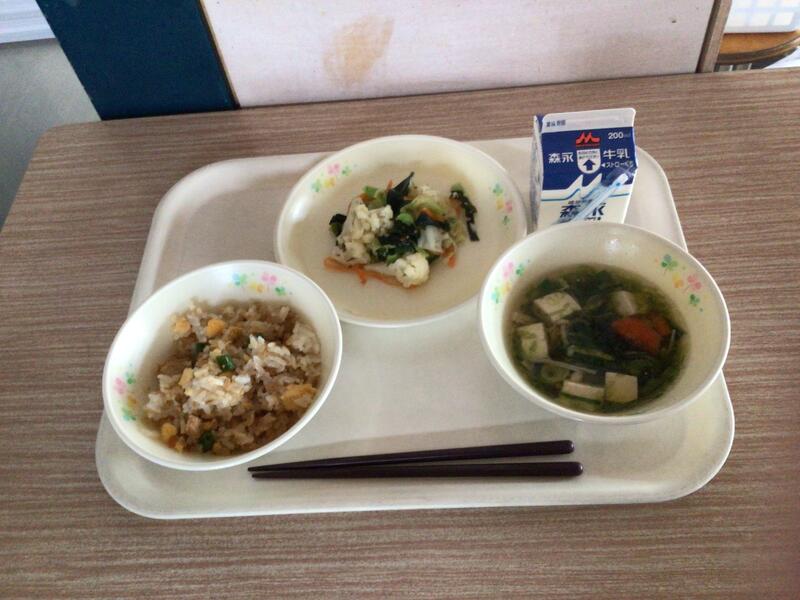 今日は、そぼろご飯です。そぼろとは、朧の意味で、元々は魚のすりつぶした身をボロボロになるまで入り煮にしたものでした。肉も同様にして食べやすく調理するものになりました。今日は、炒めて味付けした具材とご飯をしっかり混ぜ合わせました。きれいな色のあおさ汁とともに和食を楽しんでください。