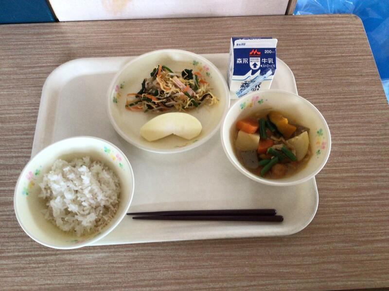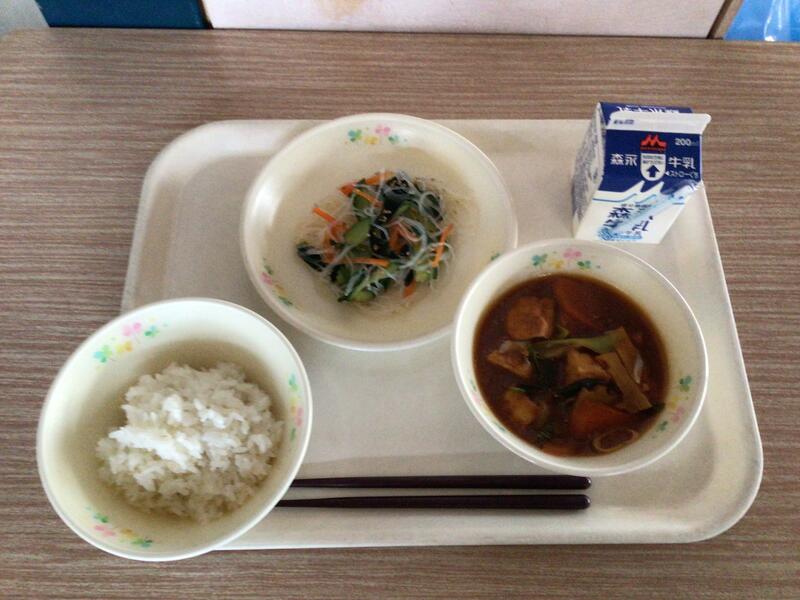 今日は、ひじきスパゲティです。ひじきは、冬から春にかけて育ち、北海道から九州まで分布する海藻です。色が黒く、細長く、食べてはぼそぼそしていて、味もあまり特徴がありません。ですが、ひじきには歯や骨を強くし、血液を作るミネラルがたっぷりあります。あげや鶏肉と煮るとおいしくなります。今日は、他に玉ねぎやにんじんなども加えて、スパゲティ麺とからめています。和風の味付けスパゲティです。よく噛んで食べてください。