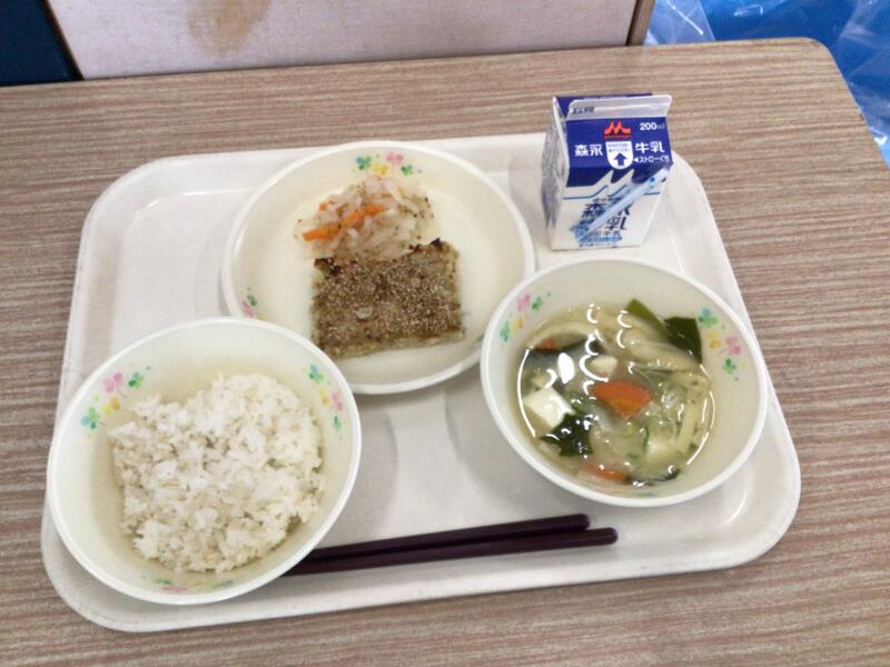 牛乳 麦ご飯 えのきとわかめのみそ汁 松風焼き 紅白なます