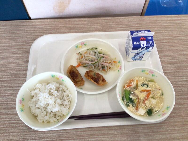 牛乳 麦ご飯 酸辣湯スープ 餃子 春雨の酢の物