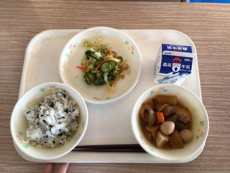 牛乳 わかめご飯 味噌おでん 土佐酢和え