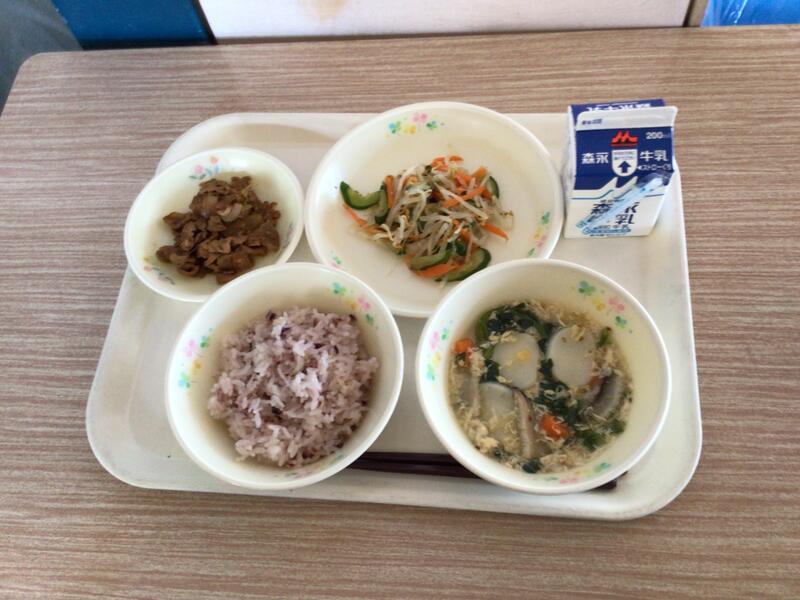 牛乳 麦ご飯 旨煮 五色和え りんご