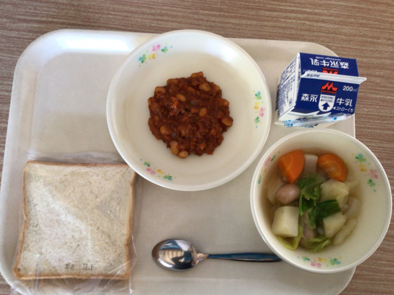 今日は、チリコンカンです。チリコンカンは、アメリカのメキシコ州発祥で、牛肉や豚肉と豆をチリソースで煮込んだスパイシーな料理です。大豆が入っているので成長期に必要な良質なたんぱく質や鉄分などをとることができます。食パンに上手に挟んだり、のせたりしてこぼさない工夫をしながら食べてください。