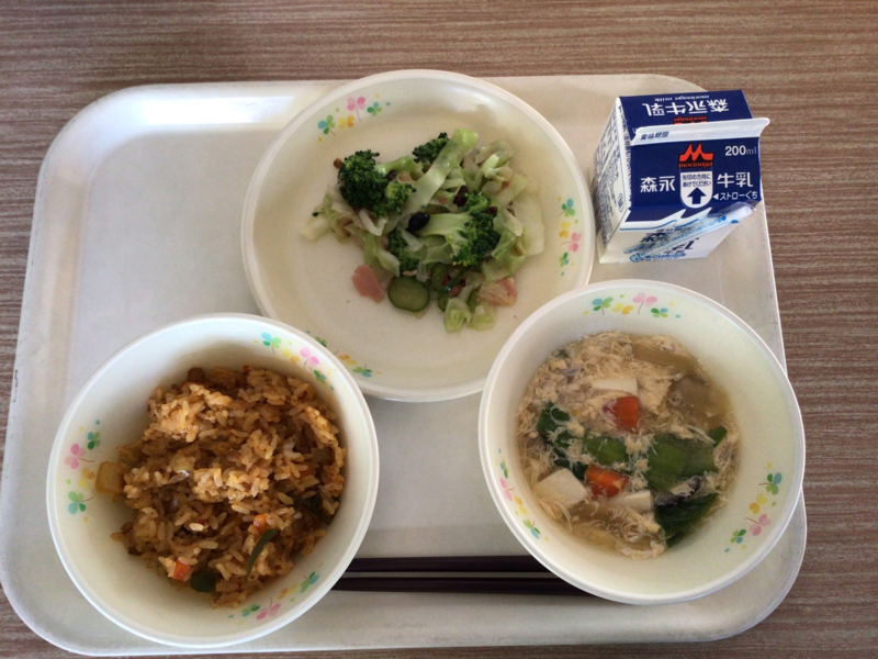 牛乳 メキシカンライス 青梗菜の卵スープ 雑穀サラダ