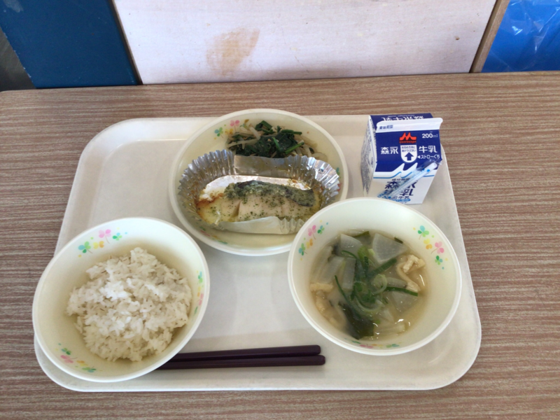 牛乳 麦ご飯 里芋のみそ汁 魚の香味焼き ごま和え