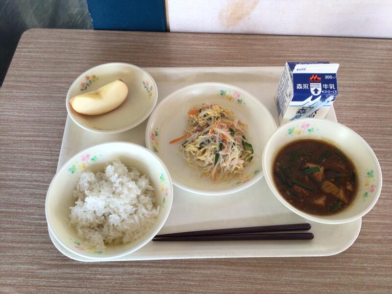 牛乳 麦ご飯 カレー麻婆 バンサンスー りんご