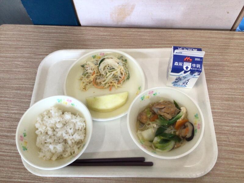 牛乳 麦ご飯 とりすき 春雨サラダ りんご