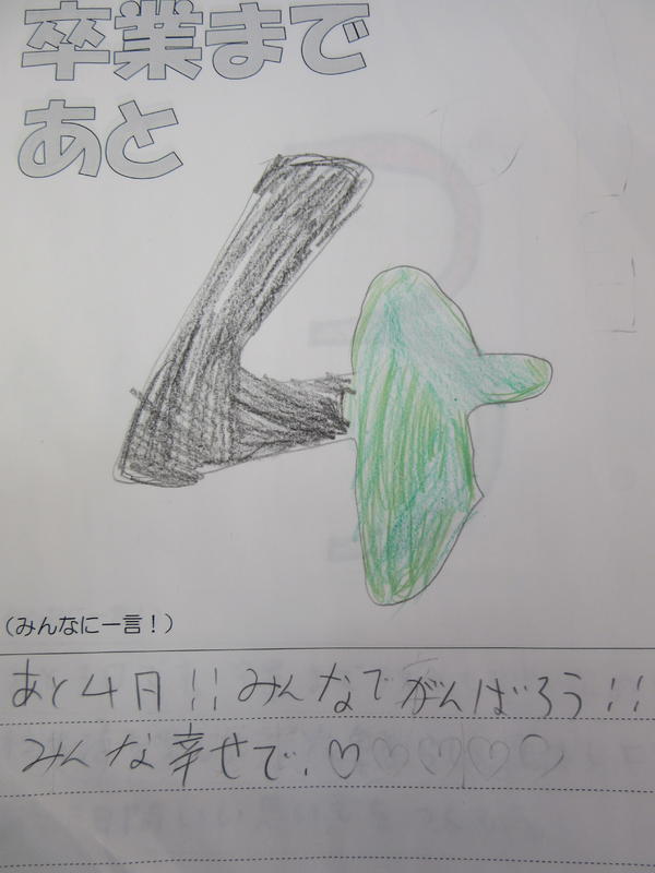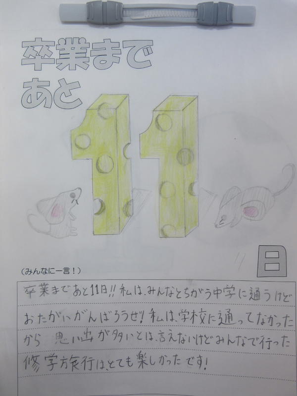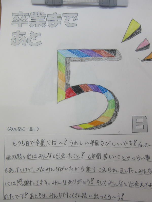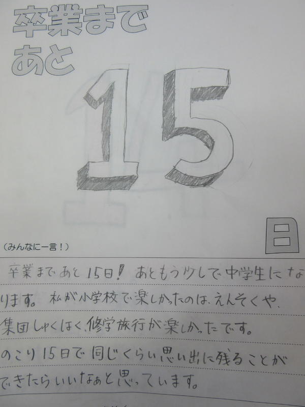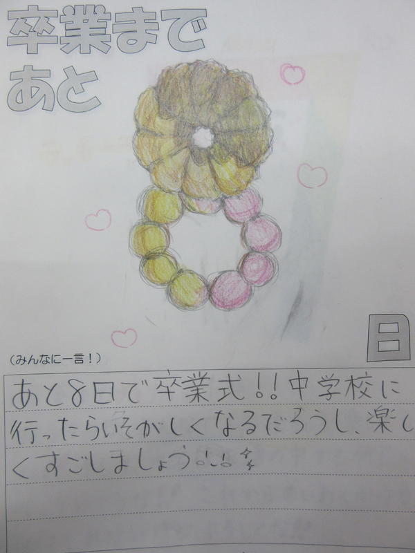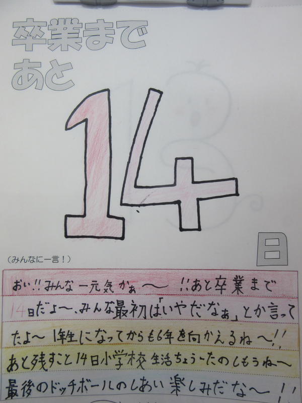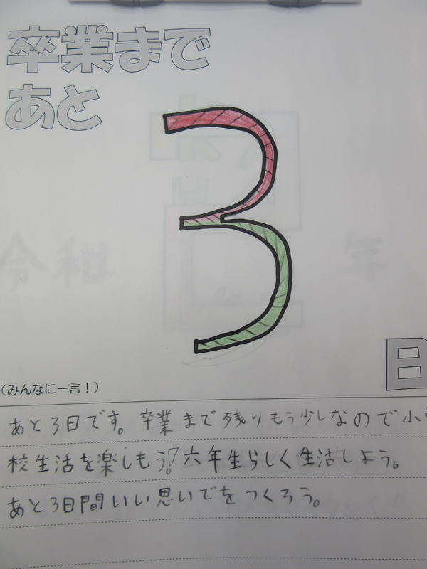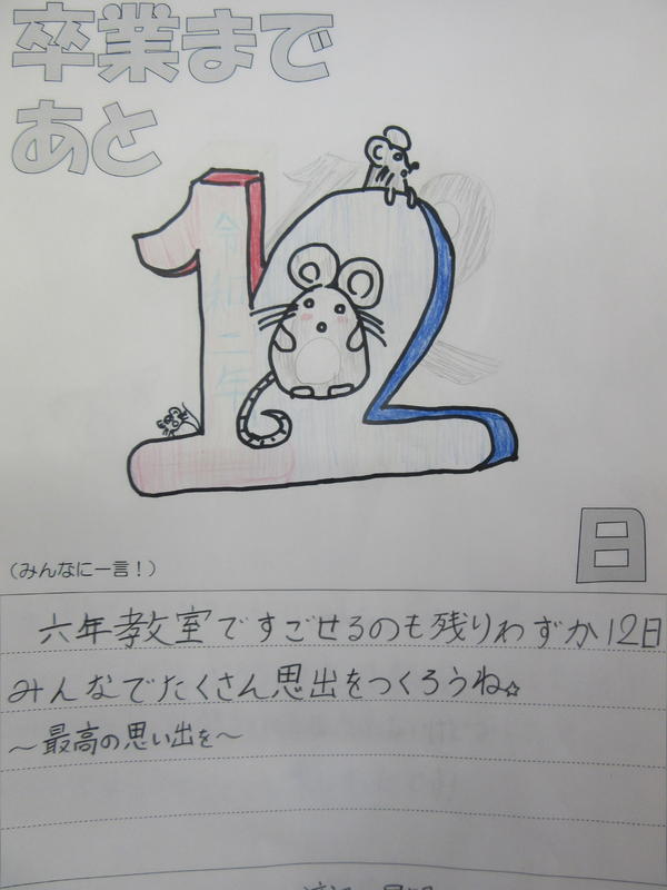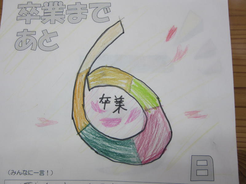 今日から卒業式まで、子どもたちが作った「卒業カウントダウンカレンダー」を載せていきます。今日から、臨時休校となり、みんなで過ごすことはできなくなってしまいましたが…卒業までの日々を、大切に過ごしてほしいと思います。