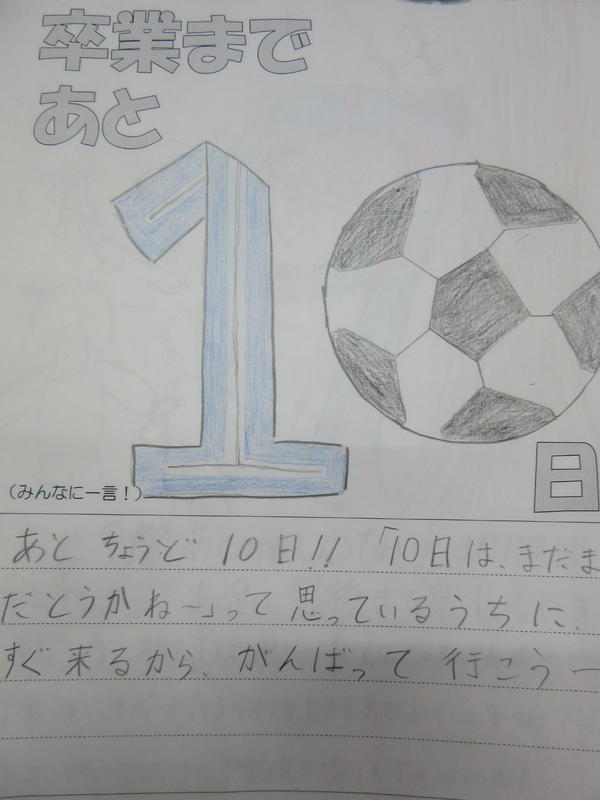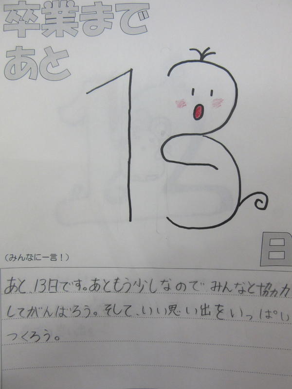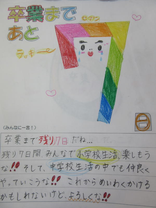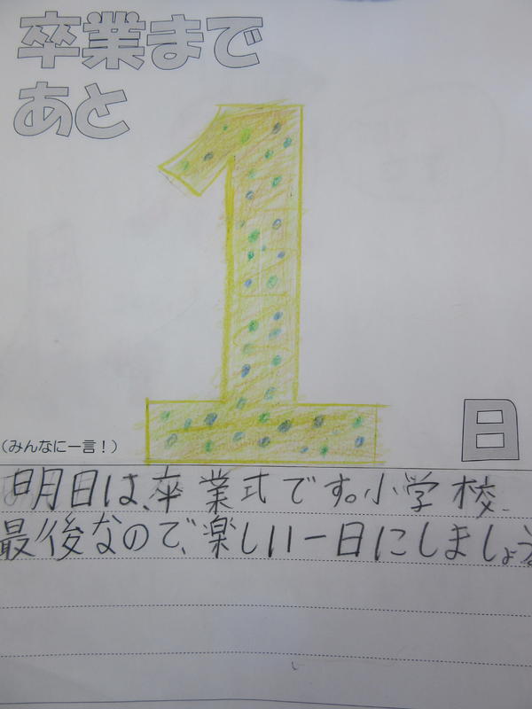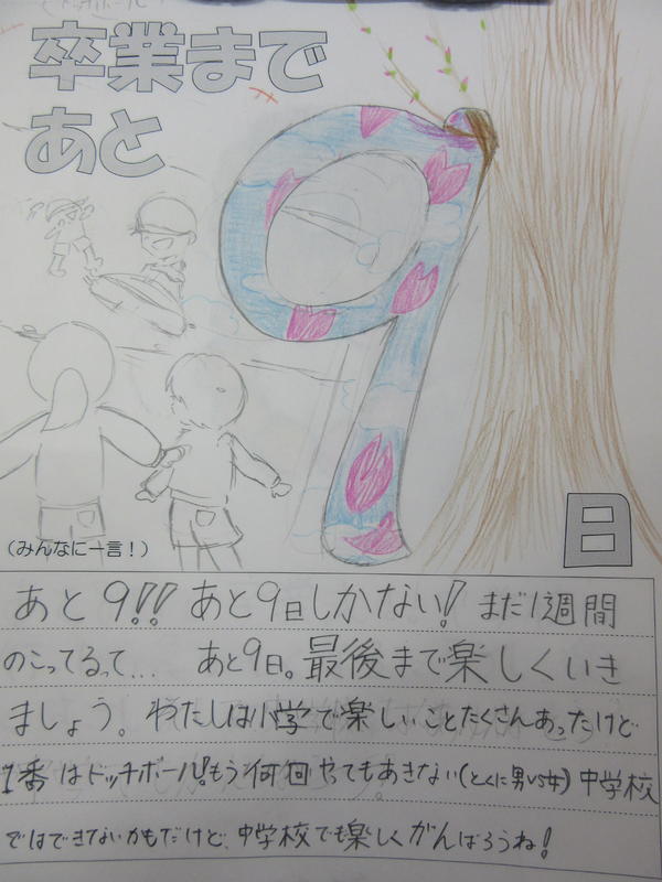 卒業まで6日、そして中学生まであと3週間です。規則正しい生活を送り、中学生になるための心と体の準備もしていきましょう!