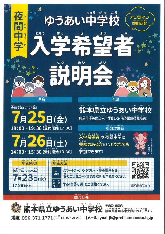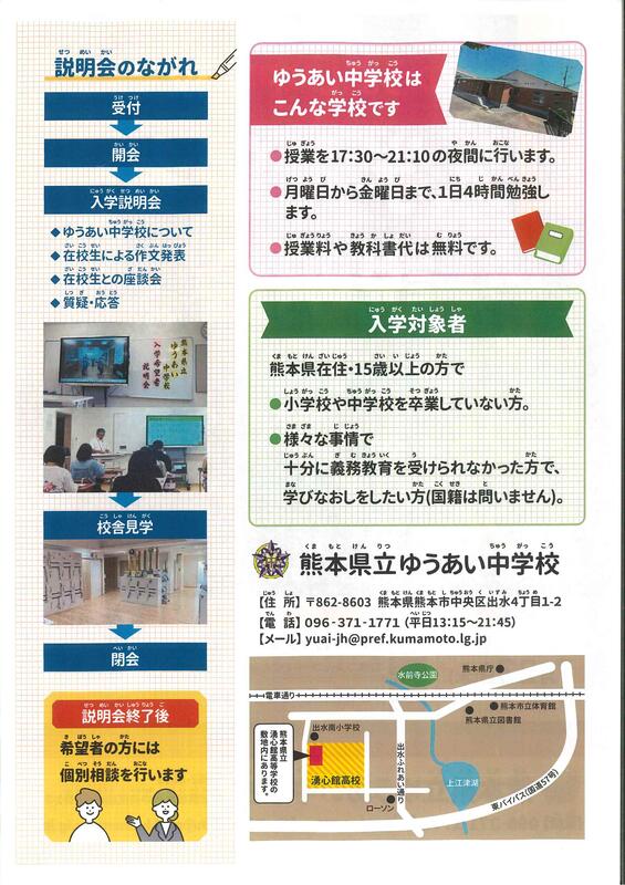 熊本県立ゆうあい中学校(夜間中学)の入学希望説明会のご案内が届いております。ぜひご一読ください。