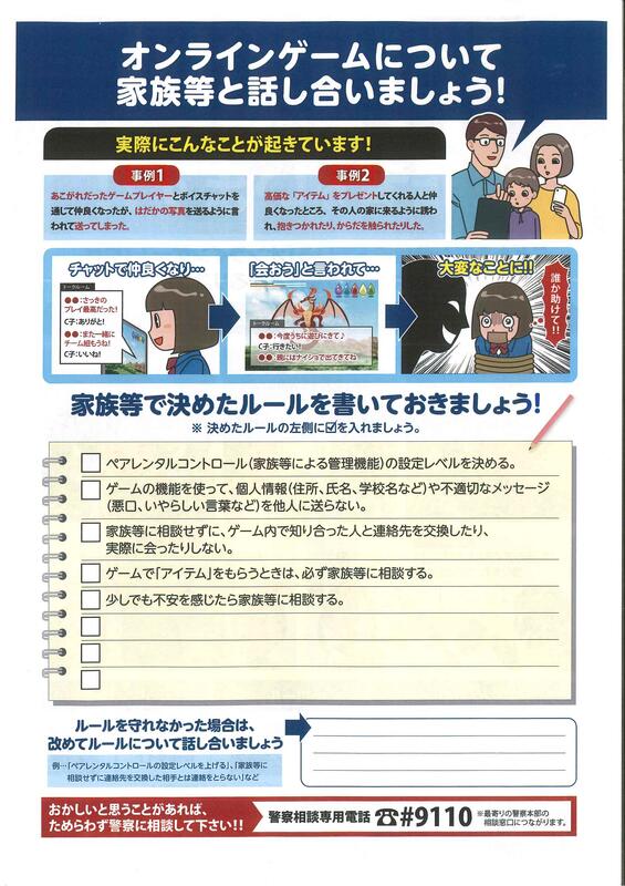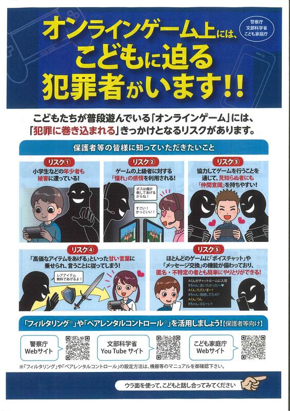 子どもがオンラインゲームをきっかけに犯罪に巻き込まれる事案が発生しています。このことについて、文部科学省より啓発資料が届きました。是非ご一読ください。