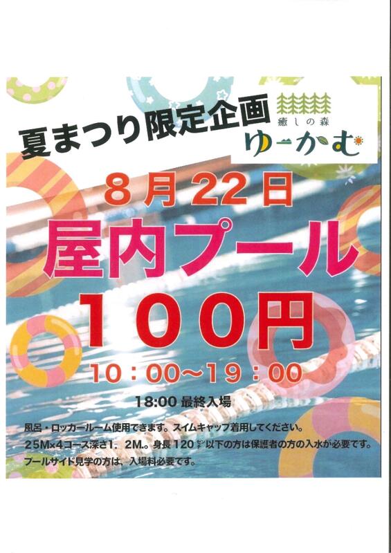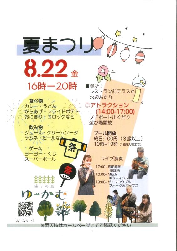 地域にある「癒しの森 ゆーかむ」にて8月22日(金)に夏祭りが行われるそうです。