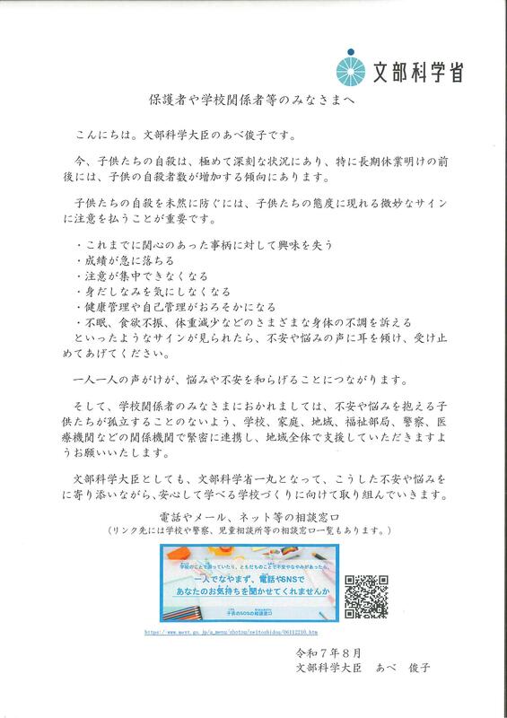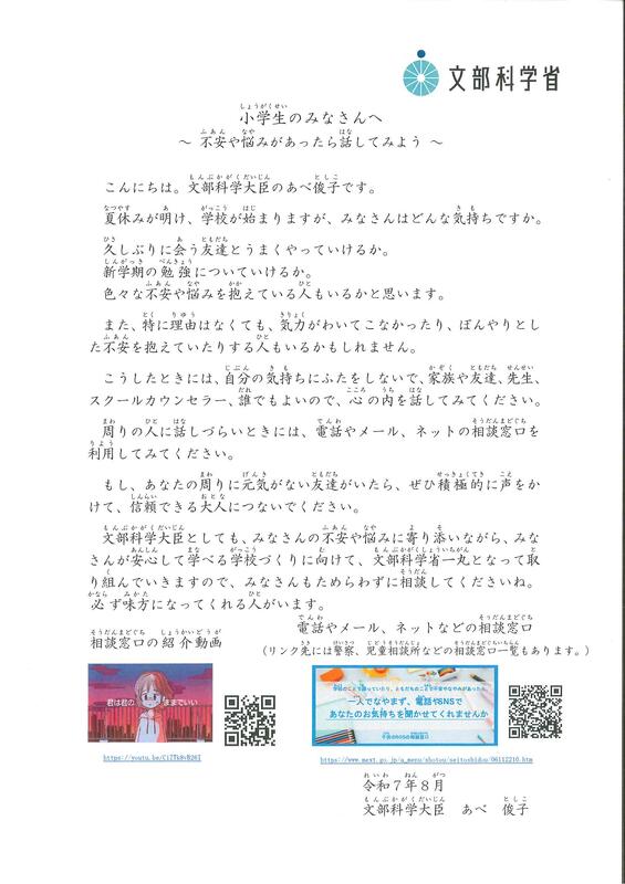 さて、文部科学大臣より表記の児童、保護者・学校関係者宛メッセージが届きました。下記にメッセージを掲載しております。夏休み明けで子どもたちが不安になる時期でもあります。メッセージを読んでいただき、子どもたちへのお声かけをお願いいたします。