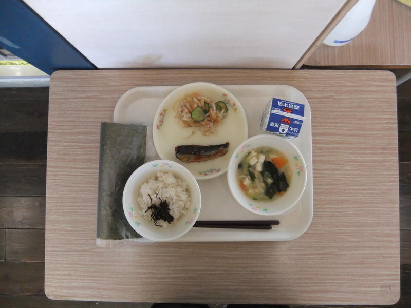 今日のもずくのスープは毎回好評です。味付けは中華風にしています。春雨も入れているので、ちゅるちゅるっと食べやすいようです。ぜひ作ってみてください。給食ではわかめ、もずく、ひじき、茎わかめ、昆布など海藻をよく使います。海藻は食物繊維が豊富で美容と健康におすすめの食材です。和えもの、汁物、混ぜご飯、かき揚げ、佃煮などに入れて、たくさん食べてください。