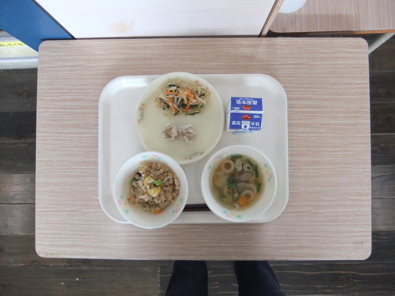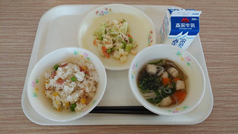 チャーハン 牛乳 もずくスープ ビーンズサラダ
