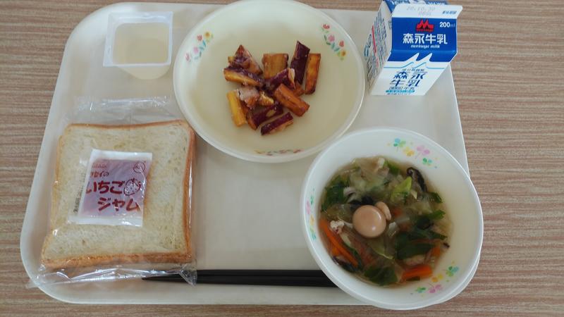 今日のフルーツパンはコッペパンに生クリーム、みかん、パイナップルを挟んで作りました。子どもが考案した朝食献立から給食のメニューに採用しました。パンにちょっと手を加えるだけで、今日一日が楽しくなりそうです。これから朝の寒さも厳しくなります。朝食を菓子パンだけですませるのではなく、具だくさんのスープをつけて、栄養バランスをよくし、体を温めてほしいと思います。