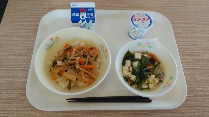 豚キムチ丼 牛乳 わかめスープ ヨーグルト