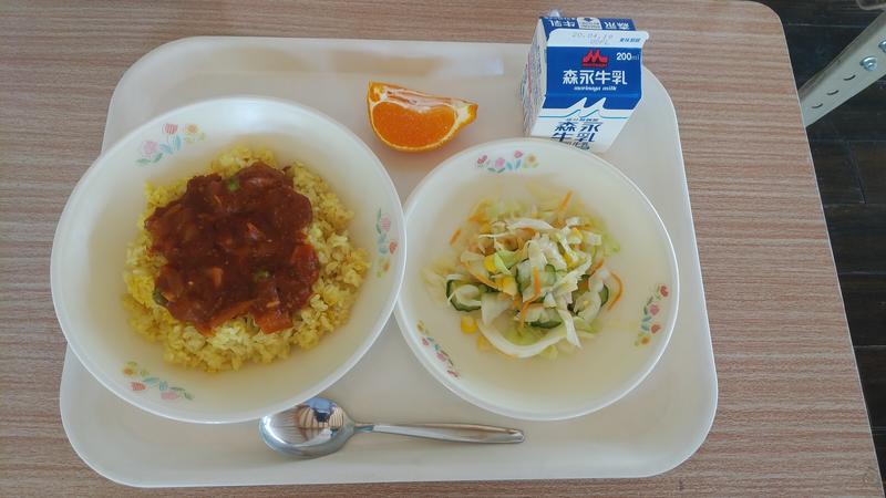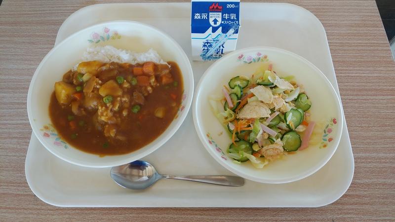 今日はカレーライスでした。手作りのカレールウは辛さは抑えめですが、香辛料の香りが食欲を増してくれます。隠し味のリンゴやチーズでコクのあるマイルドな味になります。サラダも子どもの好きなポテトチップスをかけるだけで、喜んで食べてくれました。「おいしかったです。」と何度も声をかけてくれました。