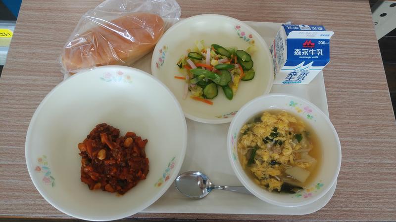 今日は、久しぶりの給食になりました。汗をかきながら、はりきって作りました。子どもたちはコロナ対策のため、グループでワイワイ食べることはできませんが、ニコニコ笑顔でモリモリ食べていました。今月は素手で触らずに食べられるよう、パンもコッペパンを多くしています。衛生面に気をつけながら、おいしさを追求していきたいと思います。お楽しみに。