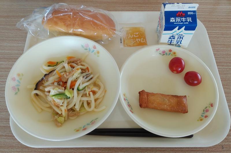 コッペパン りんごジャム 冷やしうどん 春巻き