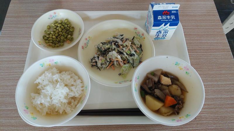 今日は牛肉たっぷりの煮物でした。減塩は体に良いだけでなく、素材のおいしさがよくわかります。給食でも調味料を控えたり、だしを効かせたりしています。抹茶豆は、地元のお茶の粉で炒り大豆を包みました。ほんのり新茶の香がして食が進みました。