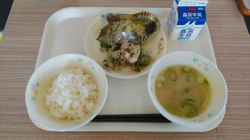 給食のご飯は麦が入っています。食物繊維を摂り、よく噛んで食べてもらうためです。また給食の米は山鹿市産米100%です。月に数回、麦のないご飯を出していますが、とてもおいしいです。今日のマヨネーズ焼きはホキを使いました。マヨネーズに、とけるチーズ、玉ねぎ、パセリを入れて食べやすくしたので、好評でした。ぜひ家でもいろいろな魚料理を食べましょう。