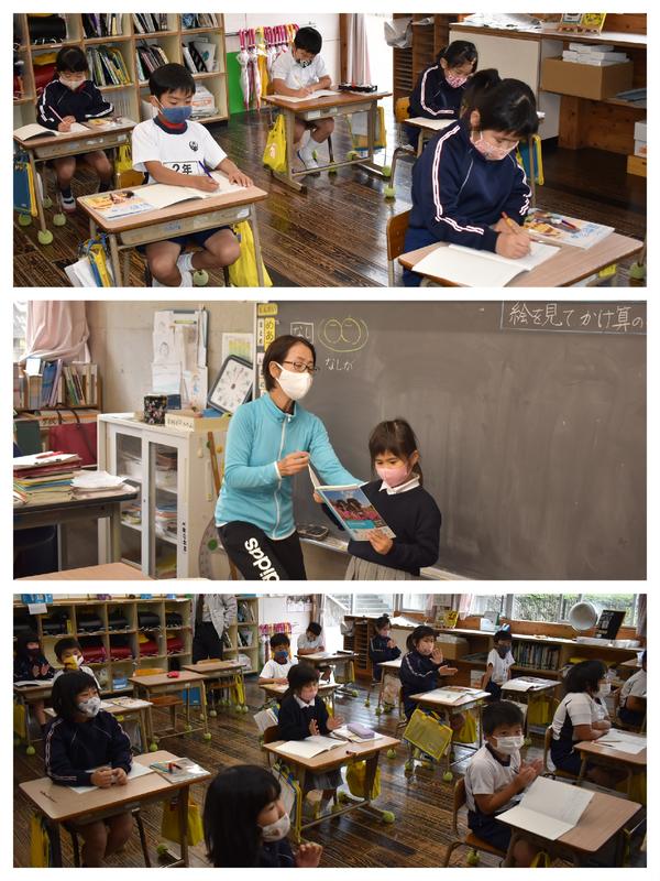 2年生は算数。掛け算の真っ最中。6の段の暗唱を一人一人確認後、7の段づくりを行っていました。みんな、掛け算の仕組みが分かり、どんどんノートにまとめていました。