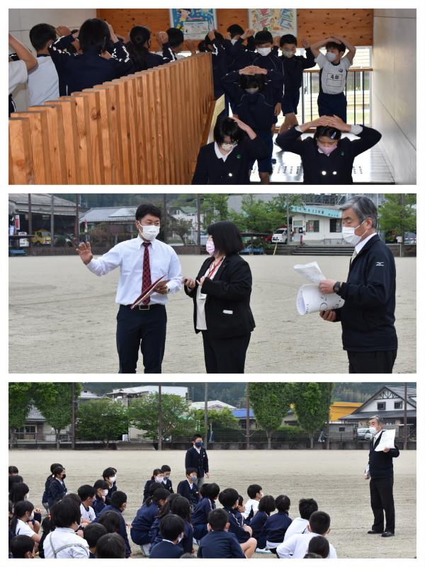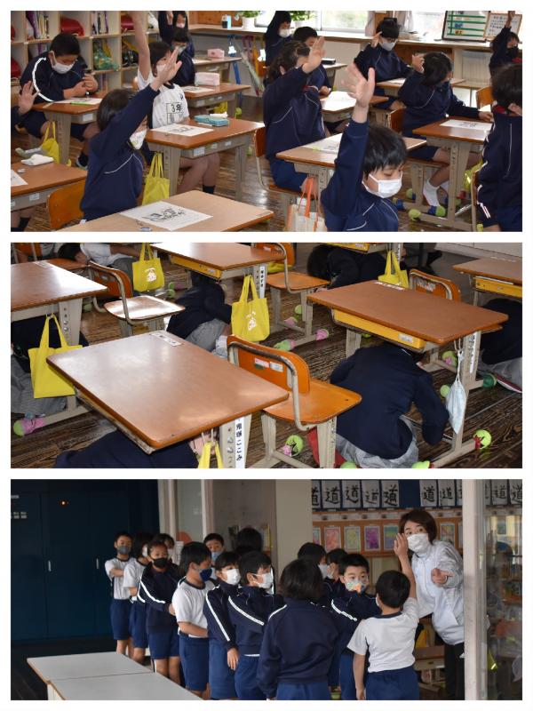 まず、地震が発生した場合の対処の仕方について担任から指導があり、その後、訓練にうつりました。地震の鳴動音が流れると子どもたちは、机の下に身を移し、じっと待ちました。避難の放送が流れると、担任の指示に従い学年ごとの避難経路を通って避難しました。当日は、教科書で頭を保護する予定でしたが、ときおり小雨が混じる天候だったため、何も持たずに避難しました。避難後は、人員点呼とその報告が行われ、全員無事に避難することができました。