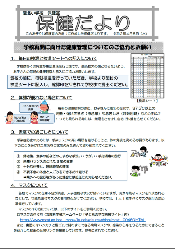 本日、保護者の方向けにほけんだよりと検温シートを配付いたしました。学校再開後の感染症対策の1つとして、集団生活を行う場に【感染源を持ち込まない・感染源を絶つ】ということがあげられます。
